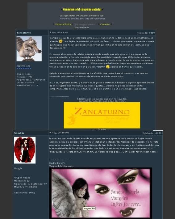NO es justo que porque no haya suficientes votos se anule el concurso de historias de cómo Helga conoció a su tejón. Lo reconozco, yo no voté, pero no pude leer todos las historias, creo que el foro me odia =( ... además tener este maravilloso cambio en los clubes tiene su precio... por cierto Vito... me matas con el tamaño chico, voy a tener que hacer modificaciones al por mayor =S